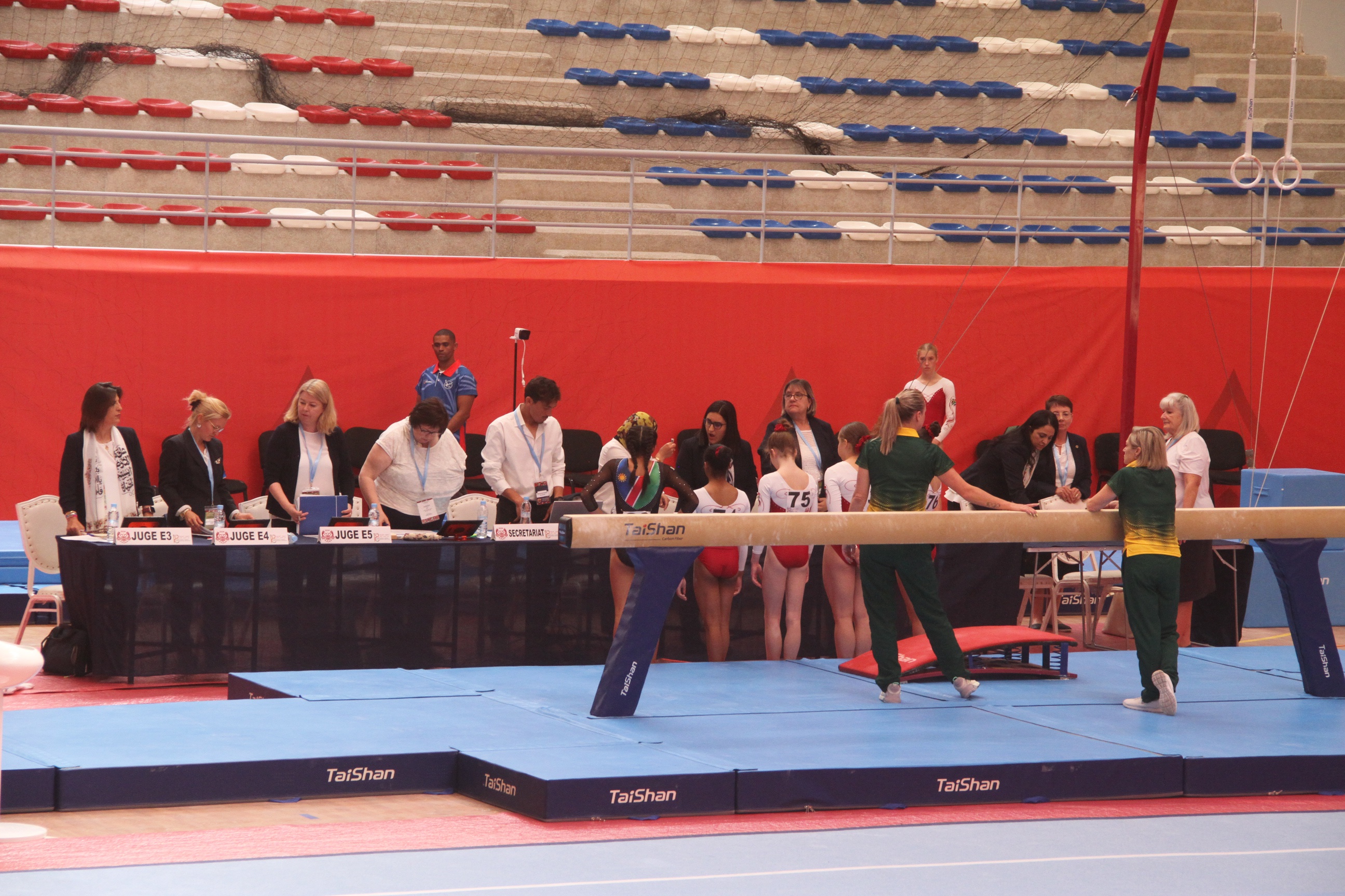 In order to ensure the excellent performance of gymnasts, Taishan Sports’ professional service team went to Marrakech to prepare for the installation and debugging of the competition venues.