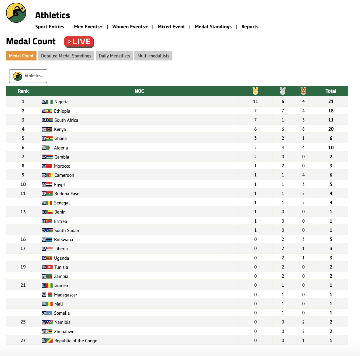 △ 非运会田径赛事奖牌榜