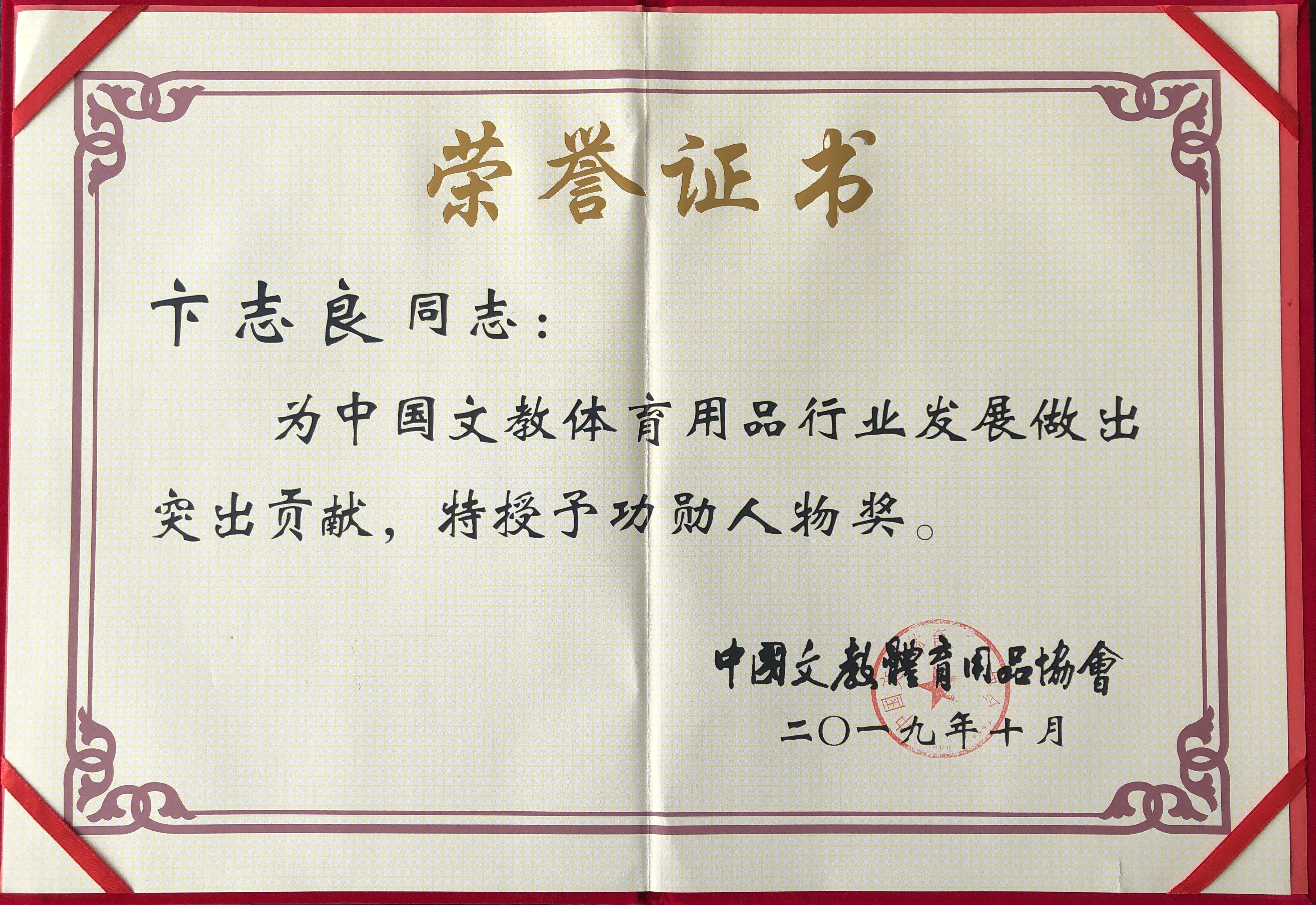 10月18日,中国文教体育用品协会第八届三次理事会暨成立三十周年庆典大会在北京人民大会堂隆重召开。1989—2019三十年间,我国文教体育用品行业发生了翻天覆地的变化,取得了辉煌的成绩。为弘扬艰苦创业、改革创新精神,鼓舞全行业奋勇前行的斗志,暨协会成立三十周年之际,文体协会隆重表彰一批为行业发展做出突出贡献的模范人物,好博体育产业集团董事长卞志良荣获“功勋人物奖”。