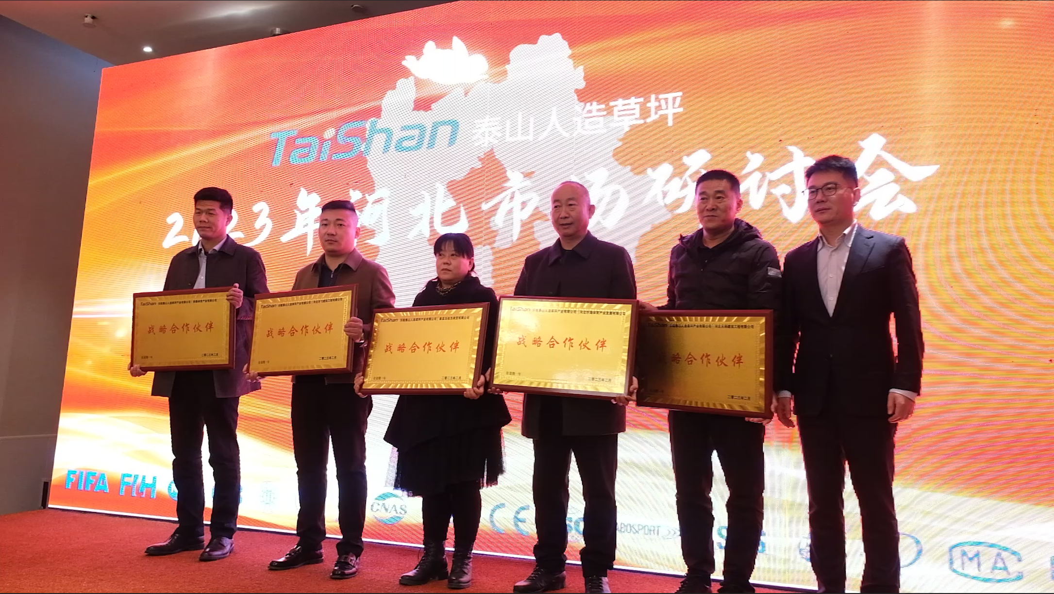 2023年2月10日,为明确2023年度市场战略部署,与合作伙伴共谋发展,好博人造草坪2023年河北市场研讨会在山东省乐陵市举办。好博体育产业集团董事长卞青峰,好博体育产业集团总裁卞笑男,乐陵好博人造草坪产业有限公司总经理时延虎,中国体育用品检测中心检验部主任刘洋及优质客户代表等出席此次活动。