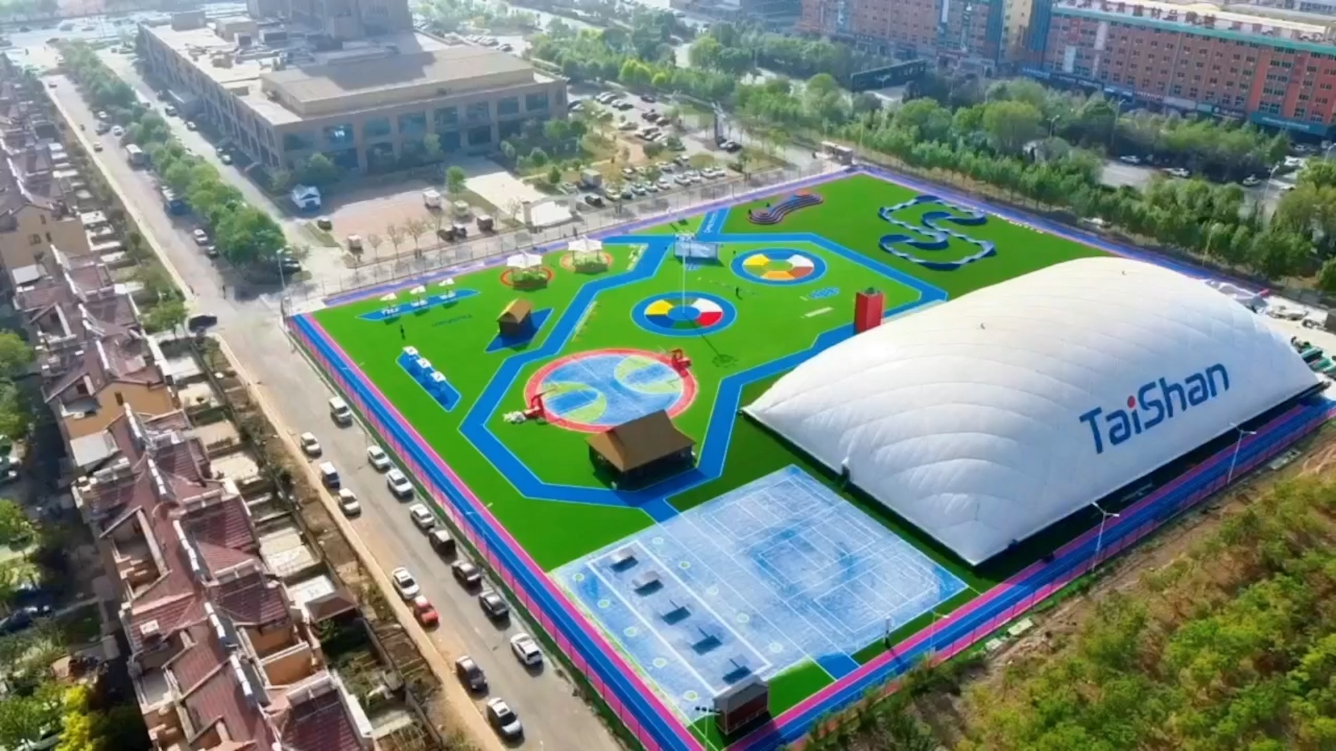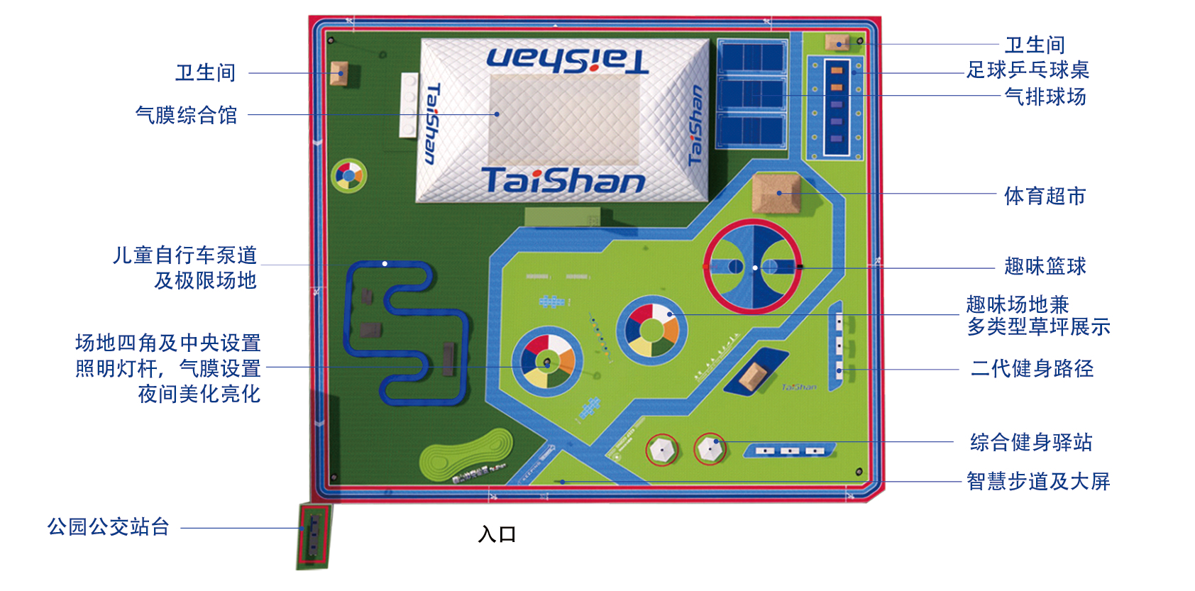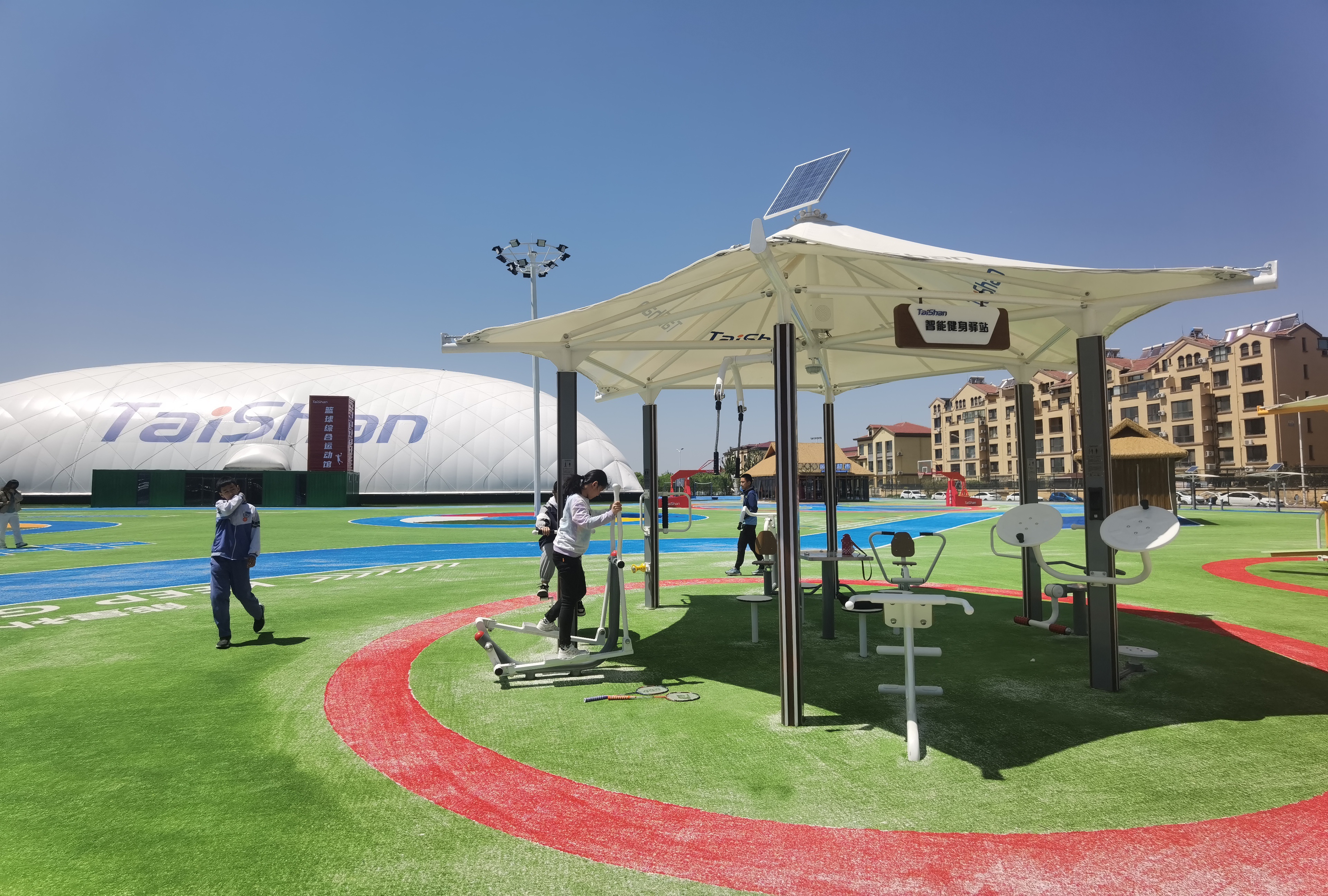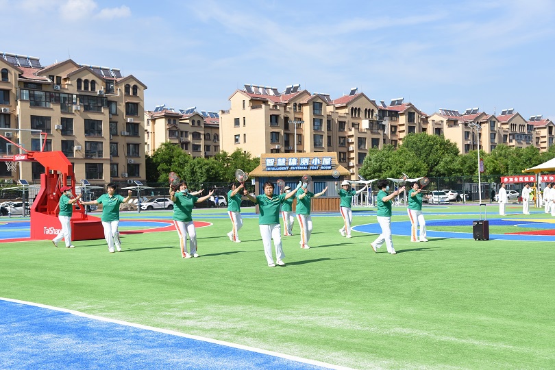 在场地铺设上,均采用好博新材料功能人造草铺设,全方位保证运动安全和环保;气膜式篮球综合运动馆,内部设置2片篮球场、6片乒乓球场地及1片网球场。网球场同时套线4个羽毛球场地。场馆内可以满足体育运动,体育教学及群众比赛需求。从场馆到运动超市、智慧体测小屋,全部采用可装配式建筑。
