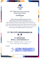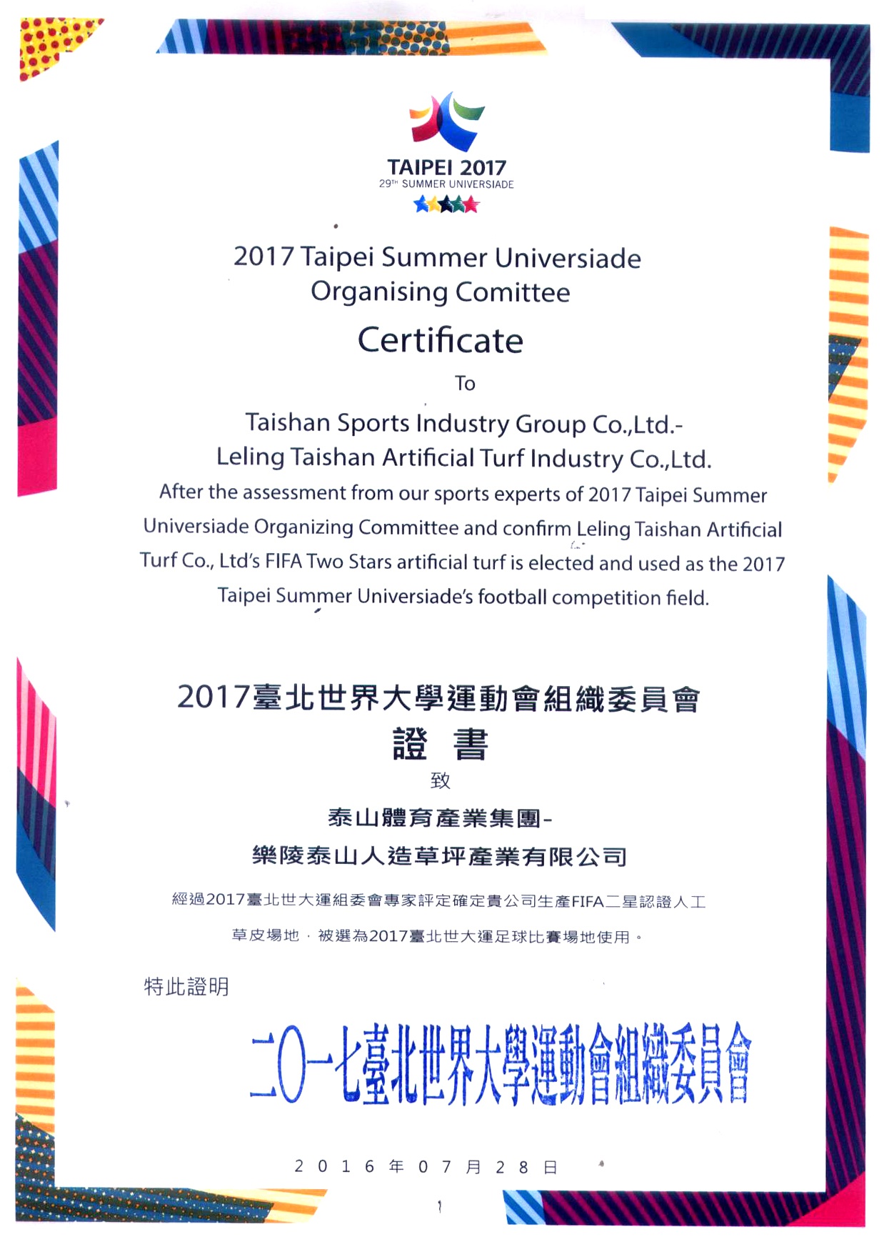 2017台北世界大学运动会组织委员会证书致乐陵好博人造草坪产业有限公司